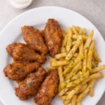 These crispy wings and garlic butter fries shine when served with your favorite dipping sauces like ranch or blue cheese. Pair them with a fresh salad or coleslaw to cut through the richness and add a refreshing crunch. For beverages, consider an ice-cold beer or a simple sparkling water with lemon for a great balance.