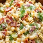 A refreshing and hearty pasta salad featuring crispy bacon, crunchy dill pickles, and a creamy dressing, perfect for summer cookouts and gatherings.