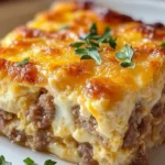 A comforting breakfast casserole filled with eggs, sausage, and cheese, perfect for family gatherings.