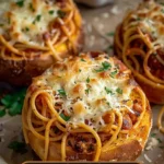 These Easy Spaghetti Garlic Bread Bowls are an absolute game-changer for dinner. They combine two beloved comfort foods—spaghetti and garlic bread—into a single scrumptious dish. The warm, crusty bread bowls are perfect for holding the savory spaghetti mixture, and the gooey mozzarella on top just adds to the irresistible charm. Plus, it’s an interactive way to enjoy your meal, allowing you to tear off bits of bread to savor every last bite of the flavorful pasta. It’s a dish that’ll surely impress your family and guests alike while being incredibly simple to whip up!