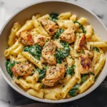 Once the chicken is cooked through, toss the drained pasta into the skillet. If you’re using spinach, now’s the time to add it as well. Mix everything together until the spinach wilts slightly, creating a vibrant and colorful dish.