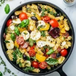 A colorful Italian pasta salad with fresh vegetables and herbs
