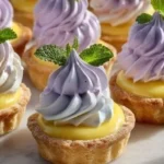 These exquisite mini lemon tarts are topped with a whimsical lilac meringue, blending tangy lemon brightness with ethereal floral sweetness.