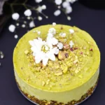 A stunning raw avocado cake featuring the combination of creamy avocados and nutty pistachios, sweetened with natural ingredients for a guilt-free dessert.