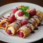 These crepes are the perfect blend of lightness and indulgence. With a subtle vanilla essence that complements the fresh raspberries, each bite is a celebration of flavor. They’re wonderfully versatile too—great as a breakfast treat, a charming dessert, or a light midday snack. The whipped cream adds a touch of elegance while ensuring you experience pure bliss with every forkful.