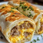 Delightful roll-ups packed with crispy sausage, fluffy scrambled eggs, and melted cheese wrapped in a soft tortilla.