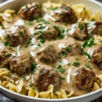 A comforting dish that combines savory Swedish meatballs with creamy mushroom soup and tender egg noodles, perfect for cozy nights in.