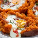 A comforting breakfast featuring tender baked sweet potatoes topped with crispy bacon, fluffy eggs, and melted cheese—a perfect morning dish.