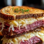 A classic Reuben sandwich made with savory corned beef, crispy rye bread, melty Swiss cheese, and tangy sauerkraut.